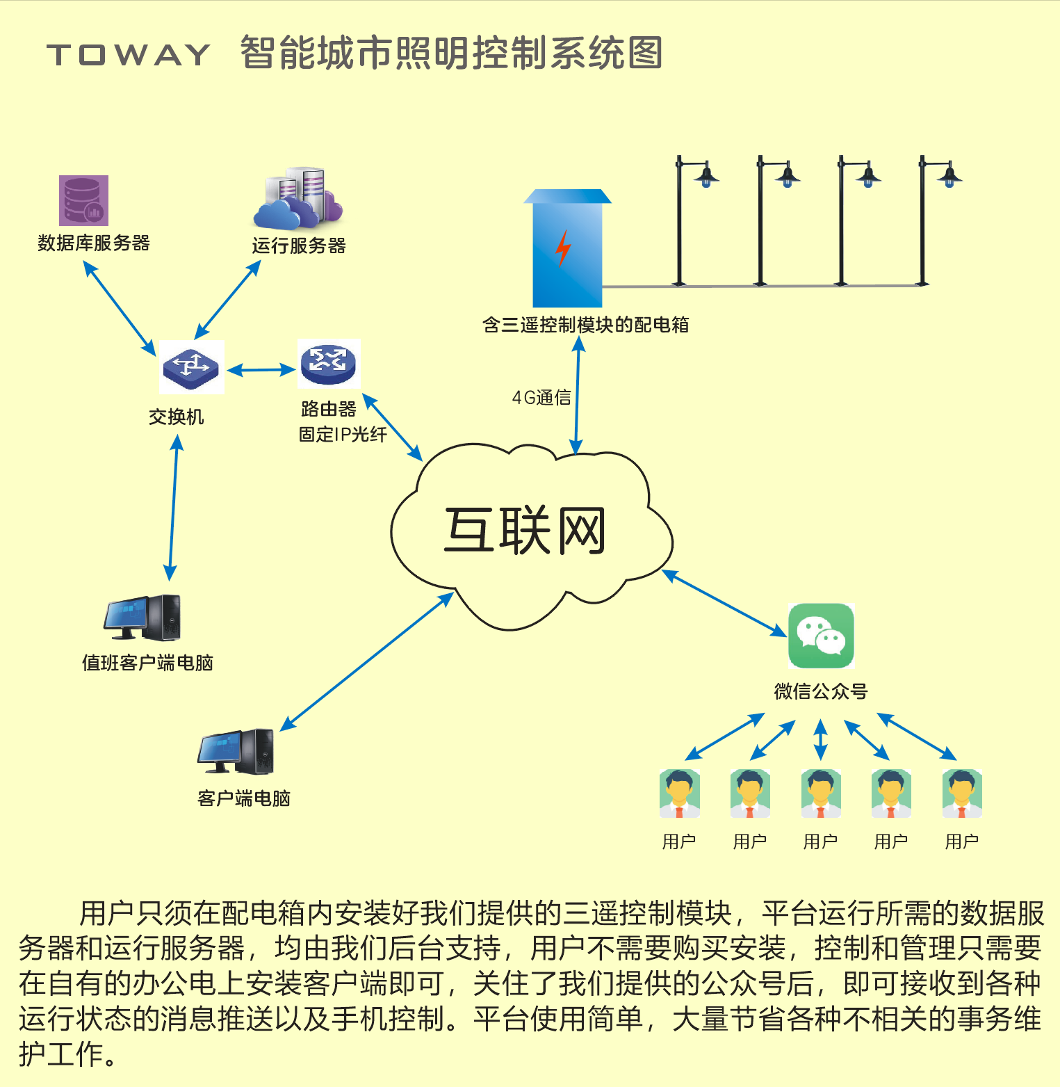 此方案對于一個縣城100臺路燈配電箱的體量,首年開支也只有三萬五千元,此后每年費(fèi)用是兩萬五,本方案最大的優(yōu)點(diǎn)就是費(fèi)用低廉,這筆費(fèi)用完全可以并入年度維護(hù)撥款中核銷。且不會有設(shè)備過保要重新采購的問題出現(xiàn)。